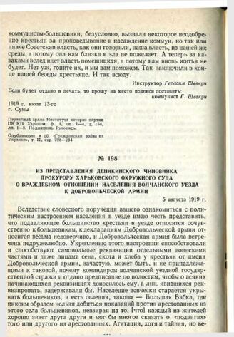 Из представления деникинского чиновника прокурору Харьковского окружного суда о враждебном отношении населения Волчанского уезда к Добровольческой армии. 5 августа 1919 г. // ЦГАОР CССР, ф. 4447, оп. 1, д. 1, л. 16. Подлинник. Опубликован в сб. «Гражданская война на Украине (1918—1920 гг.)». Сборник документов и материалов в трех томах, четырех книгах, К., «Наукова думка», 1967, т. II, с. 287.