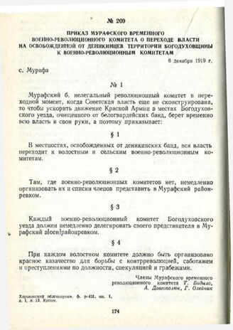 Приказ Мурафского временного военно-революционного комитета о переходе власти на освобожденной от деникинцев территории Богодуховщины к военно -революционным комитетам. 6 декабря 1919 г.