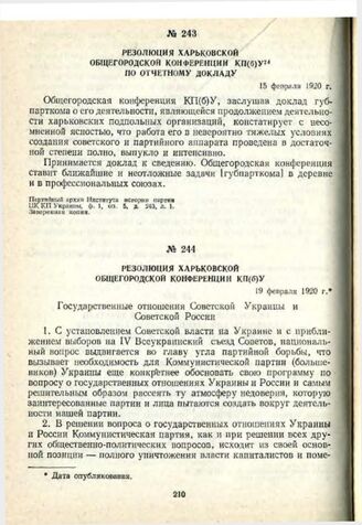 Резолюция Харьковской общегородской конференции КП(б)У по отчетному докладу. 15 февраля 1920 г. // Партийный архив Института истории партии ЦК КП Украины, ф. 1, оп. 5, д. 243, л. 1. Заверенная копия.