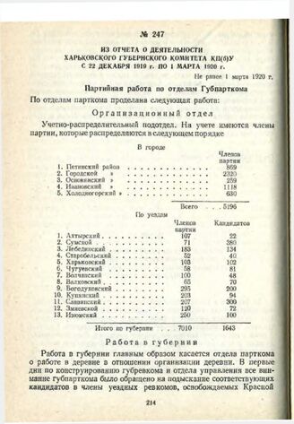 Из отчета о деятельности Харьковского губернского комитета КП(б)У с 22 декабря 1919 г. по 1 марта 1920 г. Не ранее 1 марта 1920 г. // Партийный архив Харьковского обкома КП Украины, ф. 10417, оп. 4, д. 288, лл. 5-6, 17-19, 32-41. Копия.