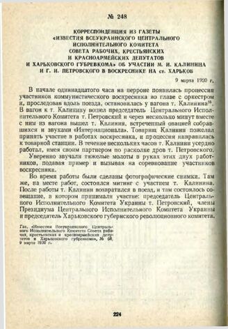 Корреспонденция из газеты «Известия Всеукраинского Центрального Исполнительного комитета Совета рабочих, крестьянских и красноармейских депутатов и Харьковского губревкома» об участии М. И. Калинина и Г. И. Петровского в воcкрecнике на ст. Харьков...