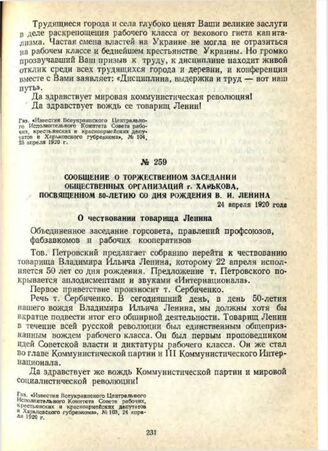 Сообщение о торжественном заседании общественных организаций г. Харькова, посвященном 50-летию со дня рождения В. И. Ленина. 24 апреля 1920 года
