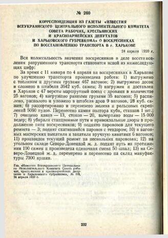 Корреспонденция из газеты «Известия Всеукраинского Центрального Исполнительного комитета Совета рабочих, крестьянских и красноармейских депутатов и Харьковского губревкома» о воскресниках по восстановлению транспорта в г. Харькове. 24 апреля 1920 г.