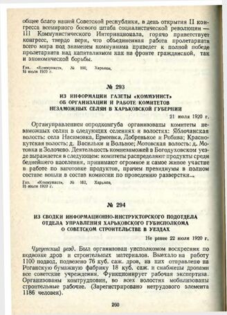 Из сводки информационно-инструкторского подотдела отдела управления Харьковского губисполкома о Советском строительстве в уездах. Не ранее 22 июля 1920 г. // Харьковский облгосархив, ф. р-432, оп. 1, д. 61, лл. 48, 49. Заверенная копия.