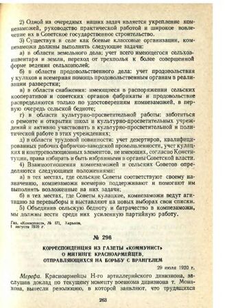 Корреспонденция из газеты «Коммунист» о митинге красноармейцев, отправляющихся на борьбу с Врангелем. 29 июля 1920 г. // Газ. «Коммунист», № 169, Харьков, 29 июля 1920 г.