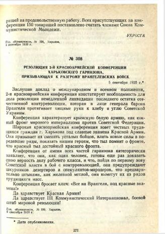 Резолюция 2-й Красноармейской конференции Харьковского гарнизона, призывающая к разгрому Врангелевских войск. 5 сентября 1920 г. // Газ. «Коммунист», № 199, Харьков, 5 сентября 1920 г.