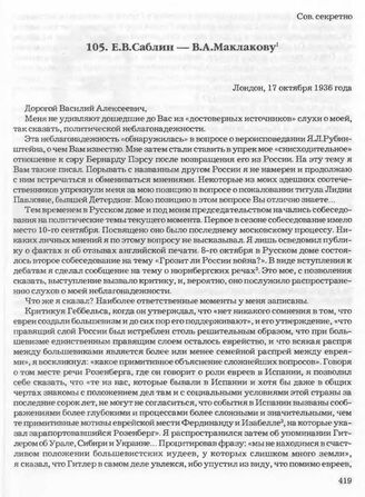 Е.В. Саблин — В.А. Маклакову. Лондон, 17 октября 1936 года // Архив СВР России, д. 16872, т. 3, л. 252-257.