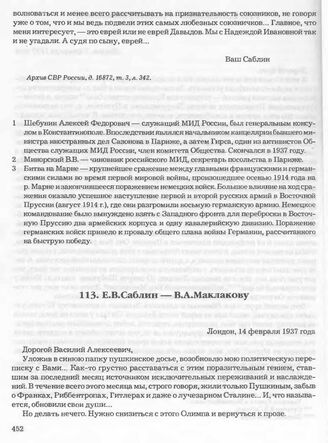 Е.В. Саблин — В.А. Маклакову. Лондон, 14 февраля 1937 года // Архив СВР России, д. 16872, т. 3, л. 423-428.