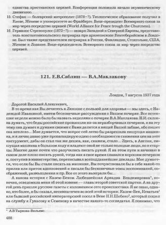 Е.В. Саблин — В.А. Маклакову. Лондон, 7 августа 1937 года // Архив СВР России, д. 16872, т. 4, л. 257-261.