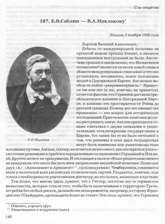 Е.В. Саблин — В.А. Маклакову. Лондон, 8 ноября 1938 года // Архив СВР России, д. 16872, т. 4, л. 603-607.