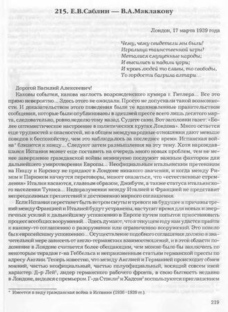 Е.В. Саблин — В.А. Маклакову. Лондон, 17 марта 1939 года // Архив СВР России, д. 16872, т. 5, л. 212-217.