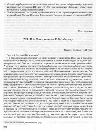 В.А. Маклаков — Е.В. Саблину. Париж, 6 апреля 1939 года