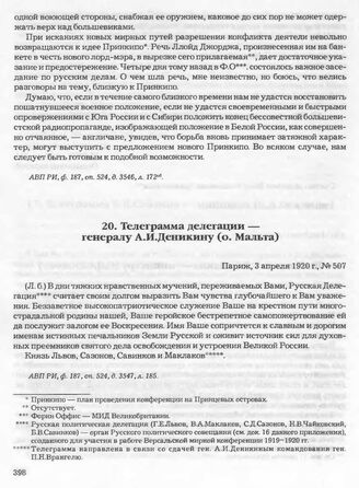 Телеграмма делегации — генералу А.И. Деникину (о. Мальта). Париж, 3 апреля 1920 г. // АВП РИ, ф. 187, оп. 524, д. 3547, л. 185.