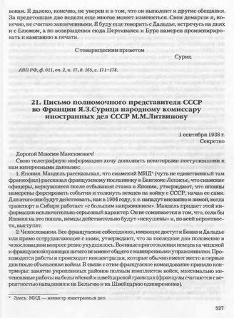 Письмо полномочного представителя СССР во Франции Я.З. Сурица народному комиссару иностранных дел СССР М.М. Литвинову. 1 сентября 1938 г. // АВП РФ, ф. 011, оп. 2, п. 17, д. 165, л. 185-187.