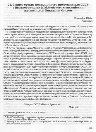 Запись беседы полномочного представителя СССР в Великобритании И.М. Майского с английским журналистом Викхемом Стидом. 23 октября 1938 г.