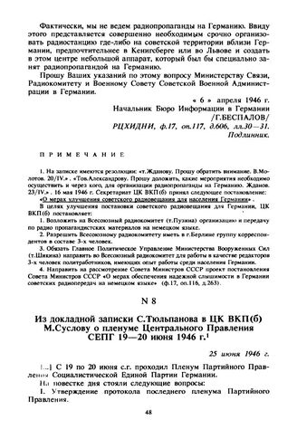Из докладной записки С. Тюльпанова в ЦК ВКП(б) М. Суслову о пленуме Центрального Правления СЕПГ 19-20 июня 1946 г. 25 июня 1946 г.