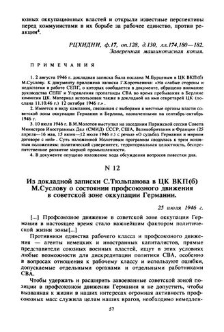 Из докладной записки С. Тюльпанова в ЦК ВКП(б) М. Суслову о состоянии профсоюзного движения в советской зоне оккупации Германии. 25 июля 1946 г. // РЦХИДНИ, ф. 17, оп. 128, д. 146, лл. 193,196-197. Подлинник.