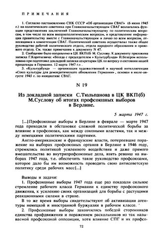 Из докладной записки С. Тюльпанова в ЦК ВКП(б) М. Суслову об итогах профсоюзных выборов в Берлине. 5 марта 1947 г. // РЦХИДНИ, ф. 17, оп. 128, д. 1094, л. л. 1,26-28. Подлинник.