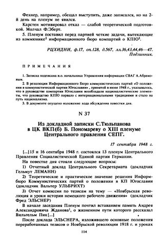 Из докладной записки С. Тюльпанова в ЦК ВКП(б) Б. Пономареву о XIII пленуме Центрального правления СЕПГ. 17 сентября 1948 г. // РЦХИДНИ, ф. 17, оп. 128, д. 567, лл. 88,90-93. Подлинник.