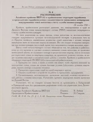 Распоряжение Алтайского крайкома ВКП(б) и крайисполкома секретарям горрайкомов и председателям горрайисполкомов о недопустимости самовольного возвращения эвакуированных семей начсостава к месту службы военнослужащих. 24 декабря 1941 г. // ГААК. Ф. П-10. Оп. 25. Д. 1. Л. 60. Заверенная копия. Машинопись.