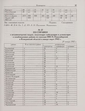 Из справки о механизаторских кадрах, подлежащих мобилизации и реэвакуации в освобожденные районы по совхозам НКСХ Новосибирской и Кемеровской областей в январе-марте 1943 г. 29 января 1943 г. // ГАНО. Ф. П-4. Оп. 7. Д. 373. Л. 9. Подлинник. Машинопись