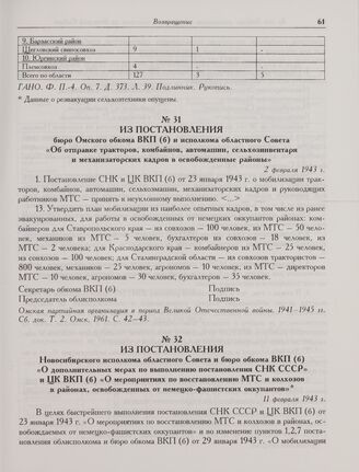 Из постановления Новосибирского исполкома областного Совета и бюро обкома ВКП(б) «О дополнительных мерах по выполнению постановления СНК СССР и ЦК ВКП(б) «О мероприятиях по восстановлению МТС и колхозов в районах, освобожденных от немецко-фашистских оккупантов». 11 февраля 1943 г.