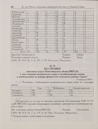Из справки совхозного отдела Новосибирского обкома ВКП(б) о ходе отправки механического парка и механизаторских кадров в освобожденные от немецко-фашистских оккупантов районы страны. 13 февраля 1943 г. // ГАНО. Ф. П-4. Оп. 7. Д. 373. Л. 83-83об. Подлинник. Машинопись.