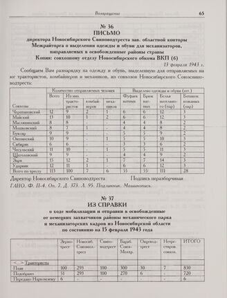 Из справки о ходе мобилизации и отправки в освобожденные от немецких захватчиков районы механического парка и механизаторских кадров из Новосибирской области по состоянию на 13 февраля 1943 года // ГАНО. Ф. П-4. Оп. 7. Д. 373. Л. 113. Подлинник. Машинопись.