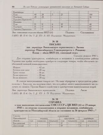 Письмо зам. директора Завьяловского зерносовхоза т. Лисина директору Новосибирского Союззернотреста т. Романову. Копия — обком ВКП (б), совхозный отдел. Середина февраля 1943 г. // ГАНО. Ф. П-4. Оп. 7. Д. 373. Л. 73. Подлинник. Машинопись.