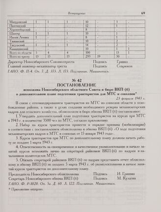Постановление исполкома Новосибирского областного Совета и бюро ВКП(б) о дополнительном плане подготовки трактористов для МТС и совхозов. 23 февраля 1943 г.