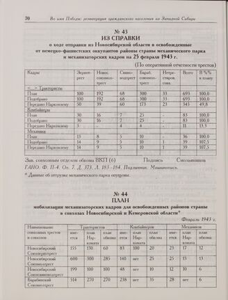Из справки о ходе отправки из Новосибирской области в освобожденные от немецко-фашистских оккупантов районы страны механического парка и механизаторских кадров на 25 февраля 1943 г. // ГАНО. Ф. П-4. Оп. 7. Д. 373. Л. 183-184. Подлинник. Машинопись.