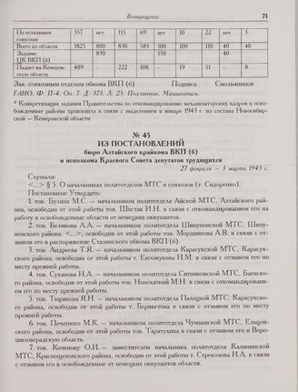 Из постановлений бюро Алтайского крайкома ВКП(б) и исполкома Краевого Совета депутатов трудящихся. 27 февраля-3 марта 1943 г. // ГААК. Ф. П-1. Оп. 18. Д. 272. Л. 310-318, 342. Подлинник. Машинопись.