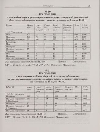Из справки о ходе мобилизации и реэвакуации механизаторских кадров из Новосибирской области в освобожденные районы страны по состоянию на 8 марта 1943 г. // ГАНО. Ф. П-4. Оп. 7. Д. 373. Л. 210-210об. Подлинник. Машинопись.