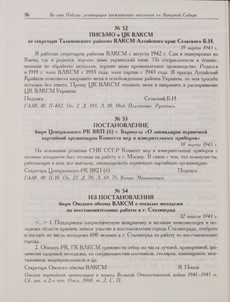 Письмо в ЦК ВЛКСМ от секретаря Тальменского райкома ВЛКСМ Алтайского края Сельского Б.И. 19 марта 1943 г. // ГААК. Ф. П-482. Оп. 2. Д. 188. Л. 10, 10об. Подлинник. Рукопись.