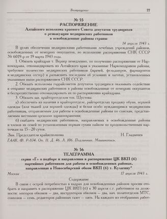 Распоряжение Алтайского исполкома краевого Совета депутатов трудящихся о реэвакуации медицинских работников в освобожденные районы страны. 14 апреля 1943 г.
