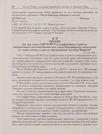Письмо зам. нач. отдела CHK РСФСР по хозяйственному устройству эвакуированного населения Быченко нач. отдела Новосибирского облисполкома по хозяйственному устройству эвакуированного населения Марковой. 12 мая 1943 г. // ГАНО. Ф. Р-1030. Оп. 1. Д. 212. Л. 120-120об. Подлинник. Машинопись.
