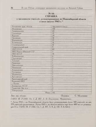 Справка о численности учителей, реэвакуированных из Новосибирской области в июле-августе 1943 г.