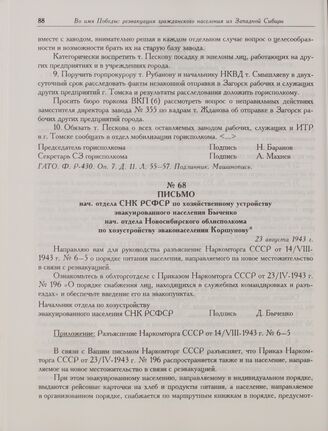 Письмо нач. отдела СНК РСФСР по хозяйственному устройству эвакуированного населения Быченко нач. отдела Новосибирского облисполкома по хозустройству эваконаселения Коршунову. 23 августа 1943 г. // ГАНО. Ф. Р-1030. Оп. 1. Д. 272. Л. 21-22. Копия. Машинопись.