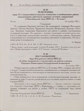 Постановление бюро Кемеровского обкома ВКП(б) об отборе коммунистов и комсомольцев для работы в органах Народного Комиссариата Государственной безопасности. 14 октября 1943 г.
