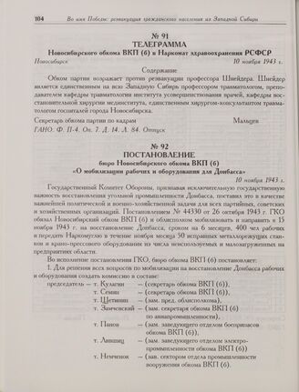 Постановление бюро Новосибирского обкома ВКП(б) «О мобилизации рабочих и оборудования для Донбасса». 10 ноября 1943 г.