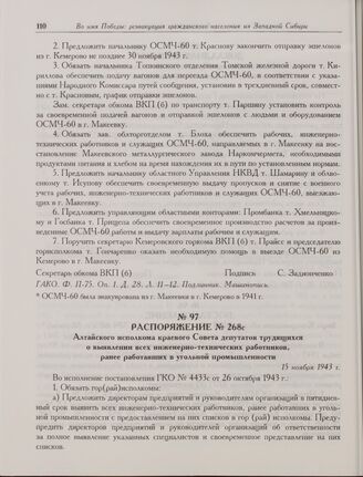 Распоряжение № 268с Алтайского исполкома краевого Совета депутатов трудящихся о выявлении всех инженерно-технических работников, ранее работавших в угольной промышленности. 15 ноября 1943 г.