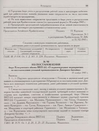 Из постановления бюро Кемеровского обкома ВКП(б) «О первоочередных мероприятиях по восстановлению угольной промышленности Донецкого бассейна». 15 ноября 1943 г. // ГАКО. Ф. П-75. Оп. 1. Д. 28. Л. 25-27. Подлинник. Машинопись.