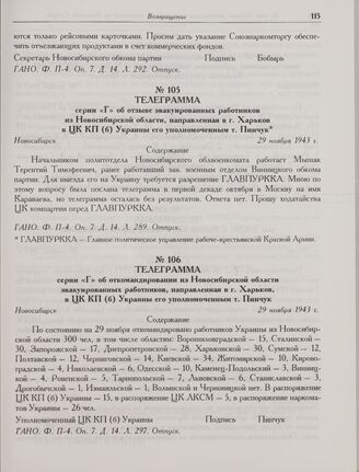Телеграмма серии «Г» об отзыве эвакуированных работников из Новосибирской области, направленная в г. Харьков в ЦК КП(б) Украины его уполномоченным т. Пинчук. Новосибирск. 29 ноября 1943 г.