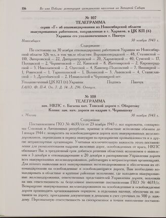 Телеграмма серии «Г» об откомандировании из Новосибирской области эвакуированных работников, направленная в г. Харьков, в ЦК КП(б) Украины его уполномоченным т. Пинчук. Новосибирск. 30 ноября 1943 г.