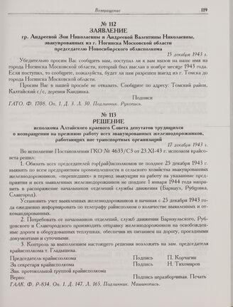 Заявление гр. Андреевой Зои Николаевны и Андреевой Валентины Николаевны, эвакуированных из г. Ногинска Московской области председателю Новосибирского облисполкома. 15 декабря 1943 г. // ГАТО. Ф. 1708. Оп. 1. Д. 3. Л. 30. Подлинник. Рукопись.