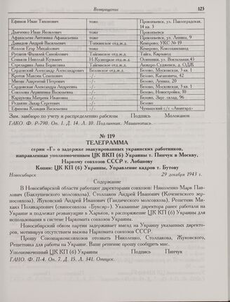 Телеграмма серии «Г» о задержке эвакуированных украинских работников, направленная уполномоченным ЦК ВКП(б) Украины т. Пинчук в Москву, Наркому совхозов СССР т. Лобанову. Копия: ЦК КП(б) Украины, Управление кадров т. Бутову. Новосибирск. 29 декабря 1943 г.