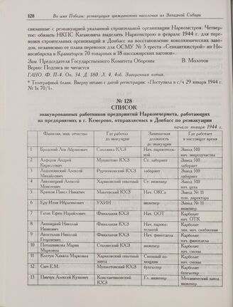 Список эвакуированных работников предприятий Наркомчермета, работающих на предприятиях в г. Кемерово, отправляемых в Донбасс по реэвакуации. Начало января 1944 г.
