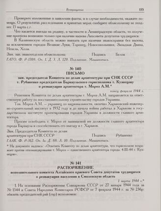 Распоряжение исполнительного комитета Алтайского краевого Совета депутатов трудящихся о реэвакуации населения в Смоленскую область. 1 марта 1944 г. // ГААК. Ф. Р-834. Оп. 1. Д. 212. Л. 226-228; Оп. 11. Д. 52. Л. 15. Подлинник. Машинопись.