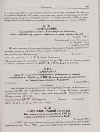 Телеграмма серии «Г» о задержке эвакуированных работников Белоруссии, направленная в г. Гомель, в ЦК КП(б) Белоруссии его уполномоченным по Новосибирской области т. Хадаркевич. Новосибирск. 4 марта 1944 г. // ГАНО. Ф. П-4. Оп. 34. Д. 179. Л. 17. Отпуск.