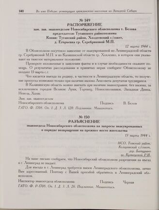 Разъяснение эвакоотдела Новосибирского облисполкома на запросы эвакуированных о порядке возвращения на прежнее место жительства. 13 марта 1944 г. // ГАТО. Ф. Р-1708. Оп. 1. Д. 3. Л. 26. Подлинник. Машинопись.